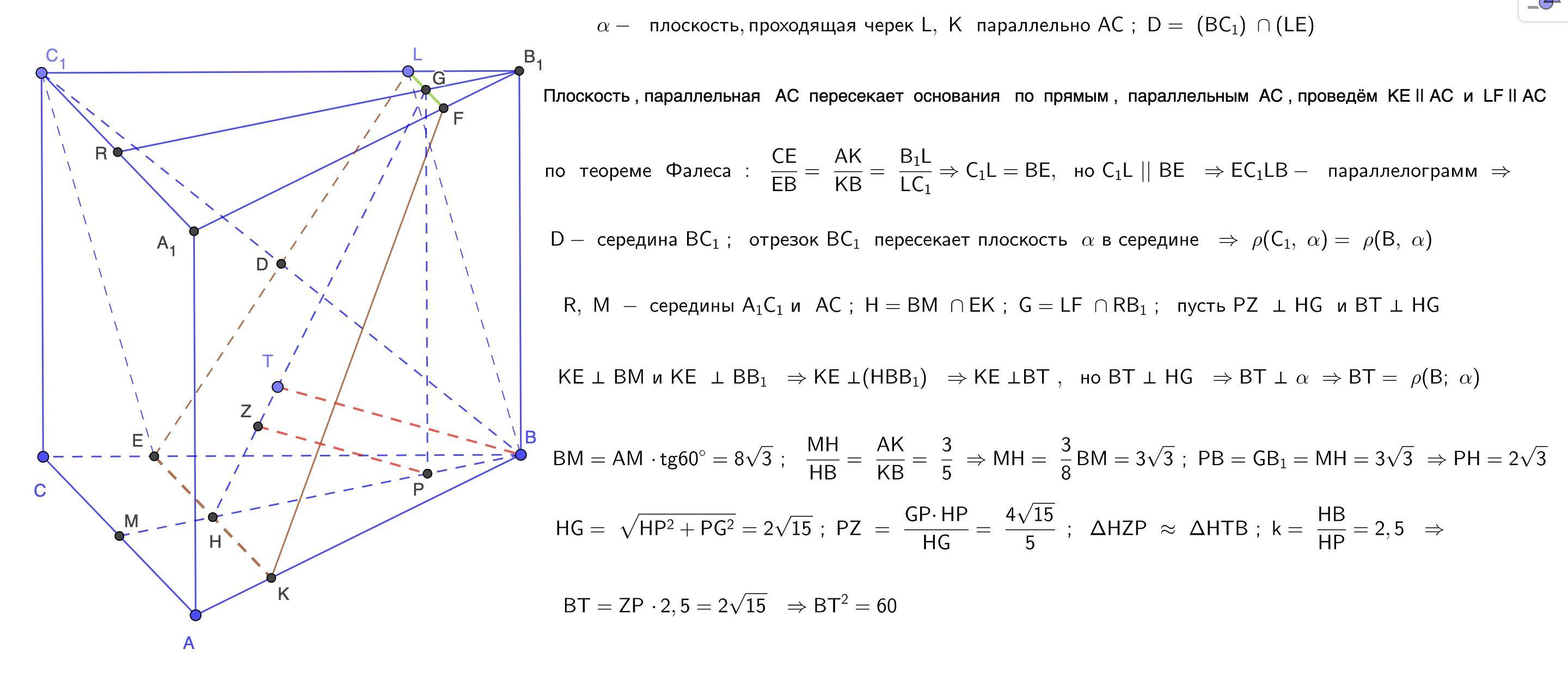 В правильной треугольной призме ABCA1B1C1 сторона основания равна 16, а боковое ребро равно 4 корень из 3 . На ребрах AB и B1C1 отмечены точки K и L соответственно, причем AK = B1L = 6. Точка M — середина ребра A1C1. Найдите квадрат расстояния от точки C1 до плоскости, которая проходит через точки K и L и параллельна прямой AC