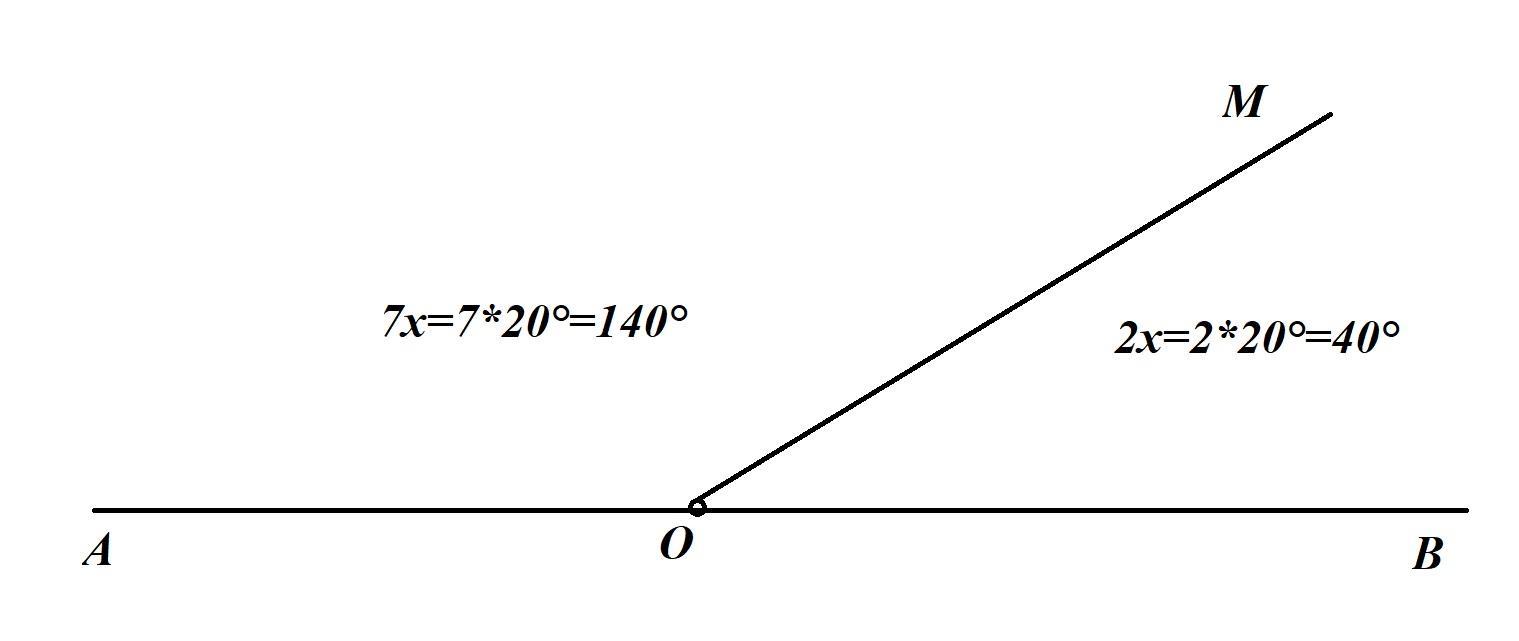 Пусть угол АОМ=7x, тогда угол ВОМ равен 2x.