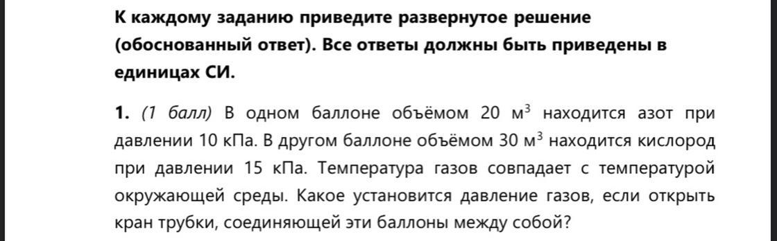 В одном баллоне объемом 20 м^3 находится азот при давлении 10 кПа. Температура газов совпадает с температурой окружающей среды. Какое установится давления газов, если открыть кран трубки, соединяющий эти баллоны между собой?