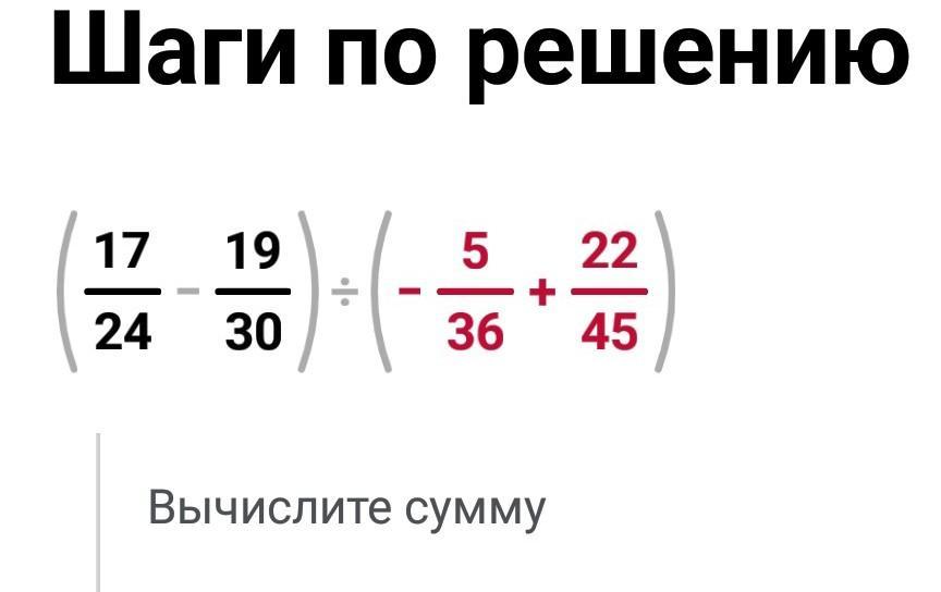 ( 17/24 - 19/30 ) : ( - 5/36 + 22/45 ) = ( 85 - 76 )/120 : ( - 25 + 88 )/180 =