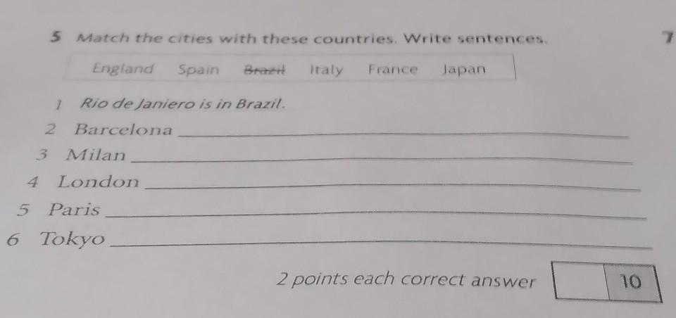 5 Match the cities with these countries. Write sentences. 7 England Spain Italy France Japan 7 Rio de laveros in Brazil. 2 Barcelona 4 London 5 Paris 6 Tokyo 2 points each correct answer 10