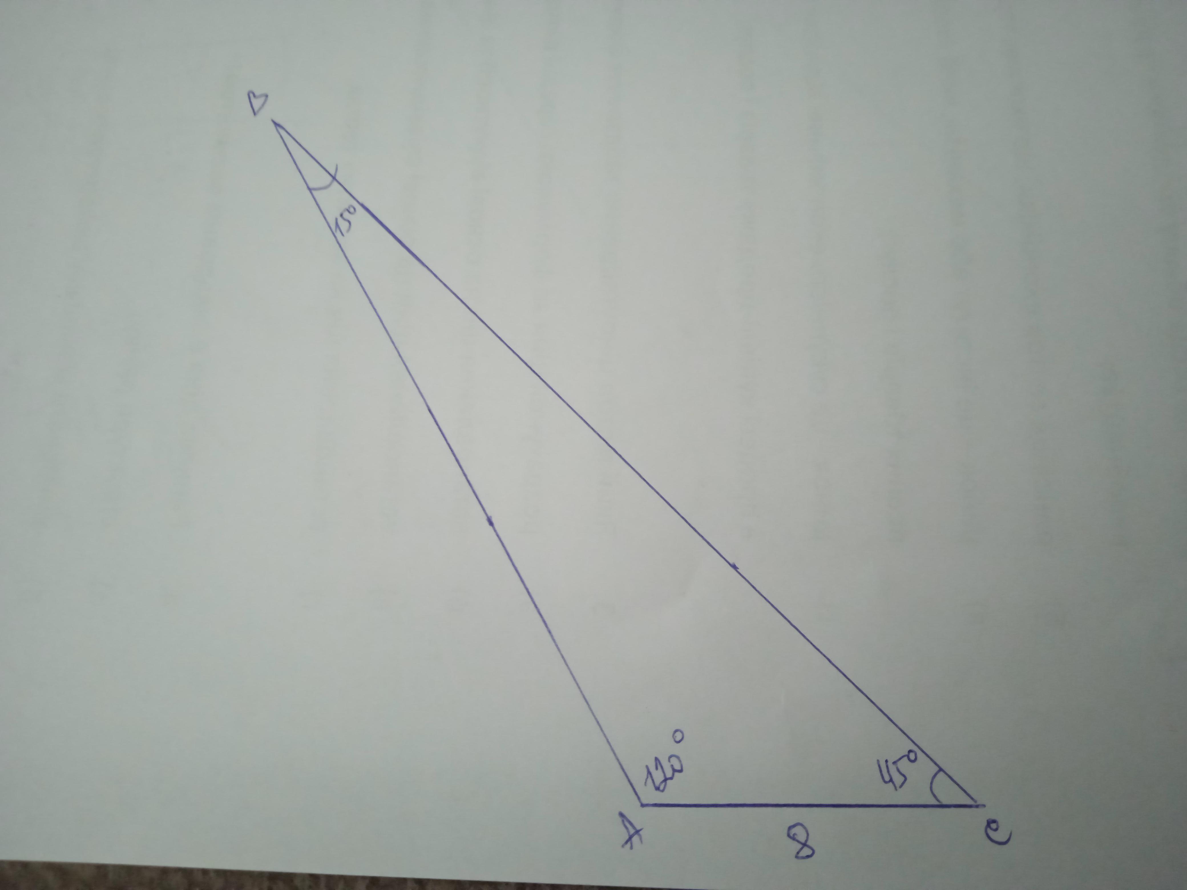 Два угла треугольника равны 45° и 120°, а сторона, лежащая против меньшего из них, равна 8. Найдите сторону треугольника, лежащую против большего из данных углов. Выполните рисунок к задаче и запишите подробное решение.