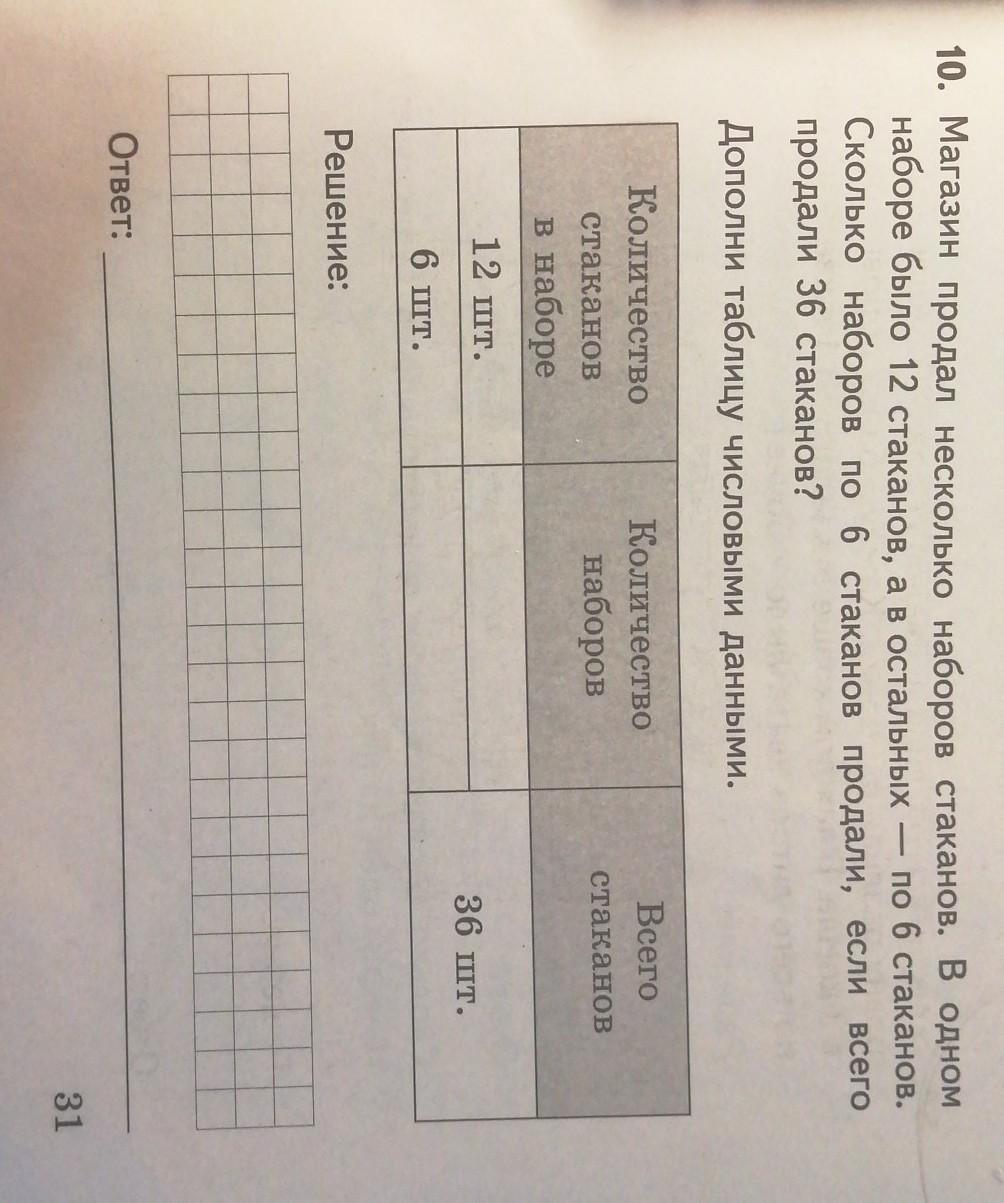 10. Магазин продал несколько наборов стаканов. В одном наборе было 12 стаканов, а в остальных — по б стаканов. Сколько наборов по 6 стаканов продали, если всего продали 36 стаканов? Дополни таблицу числовыми данными. Количество Количество наборов Всего Стаканов Стаканов в наборе 12 IIT. 36 T. 6 шт. Решение: Ответ: