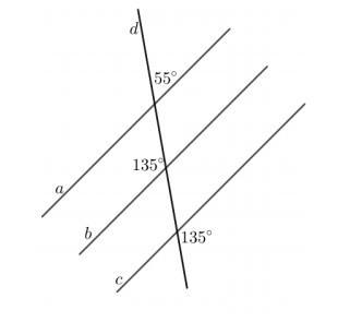 при пересечении прямых а,c секущей d односторонние углы должны в сумме давать 180°, а их сумма равна 135+55=190, следовательно, прямые не параллельны