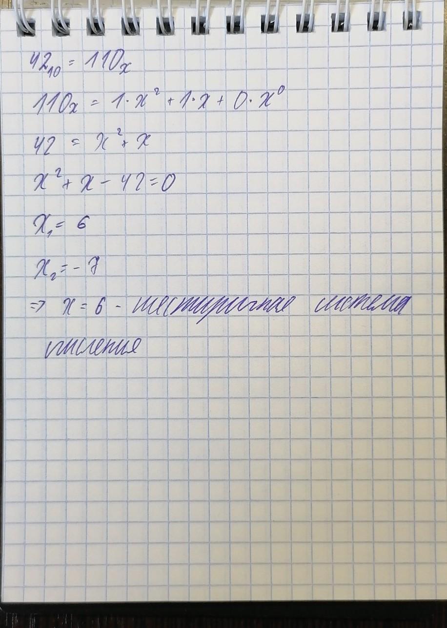 1 * n² + 1 * n¹ + 0 * n⁰ = 42₁₀ (так как 110ₙ = 42₁₀; а 110ₙ = 1 * n² + 1 * n¹ + 0 * n⁰)