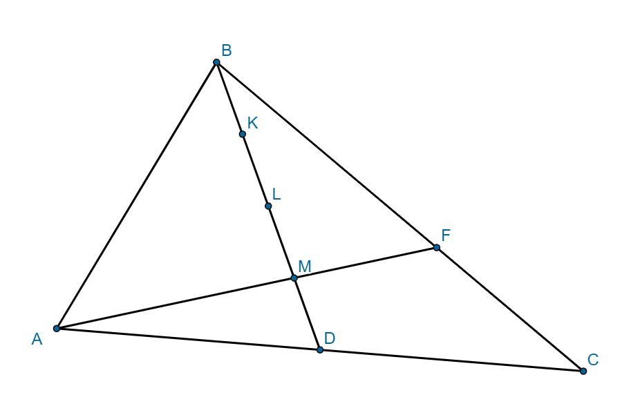 Пожалуйста, помогите) Точки K,L,M ділять медіану трикутника АВС на 4 рівні частини (ВК=КL=LM=MD). AM перетинає ВС у точці F. Знайдіть CF:FB