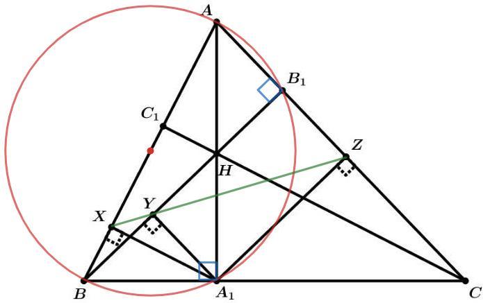 Пусть AA1, BB1, CC1 — высоты остроугольного треугольника ABC, пересекающиеся в точке H. Точки X, Y, Z — основания перпендикуляров из точки A1 на прямые AB, BB1, AC соответственно. Выберите 4 точки: 3 вершины треугольника и точку, лежащую на описанной окружности этого треугольника, такие, что на картинке есть 3 точки, лежащие на прямой Симсона выбранной точки относительно выбранного треугольника