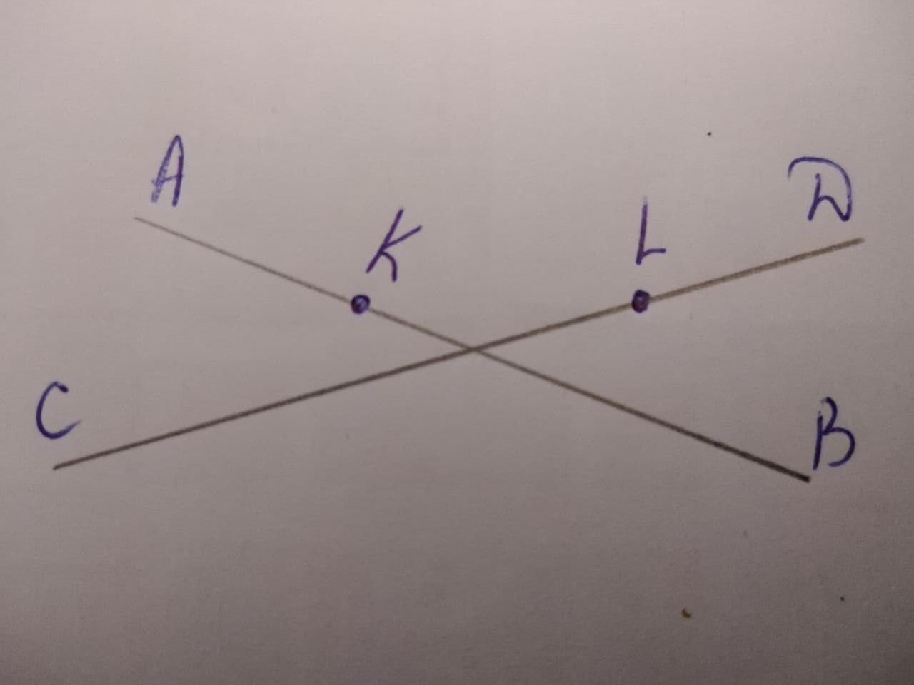 1. Начертите две пересекающиеся прямые AB и ср. Отметьте точку к, лежащую на прямой AB, и точку L, лежащую на прямой CD.