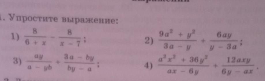4)a²x²+36y²/ax-6y + 12axy/6y-ax=a²x²+36y²/ax-6y + 12axy/-(ax-6y)=a²x²+36y²/ax-6y - 12axy/ax-6y=a²x²-12axy+36y²/ax-6y = (ax-6y)²/ax-6y=ax-6y
