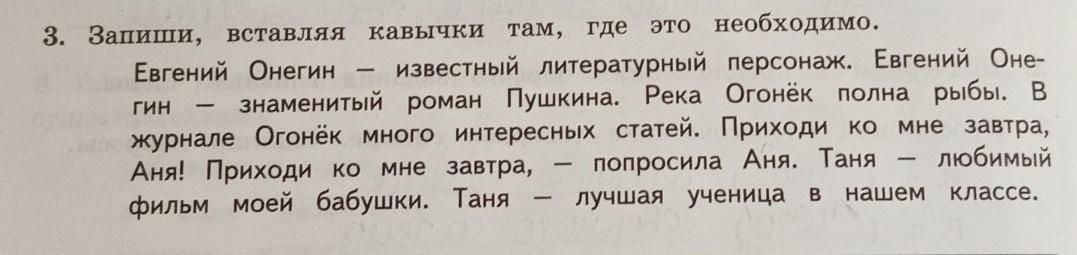 "Евгений Онегин" - знаменитый роман Пушкина. В журнале " Огонëк" много интересных статей. "Приходи ко мне завтра", - попросила Аня. " Таня" - любимый фильм моей бабушки.