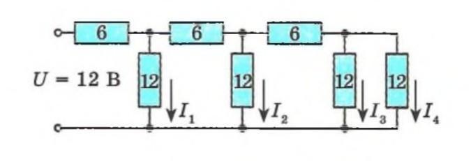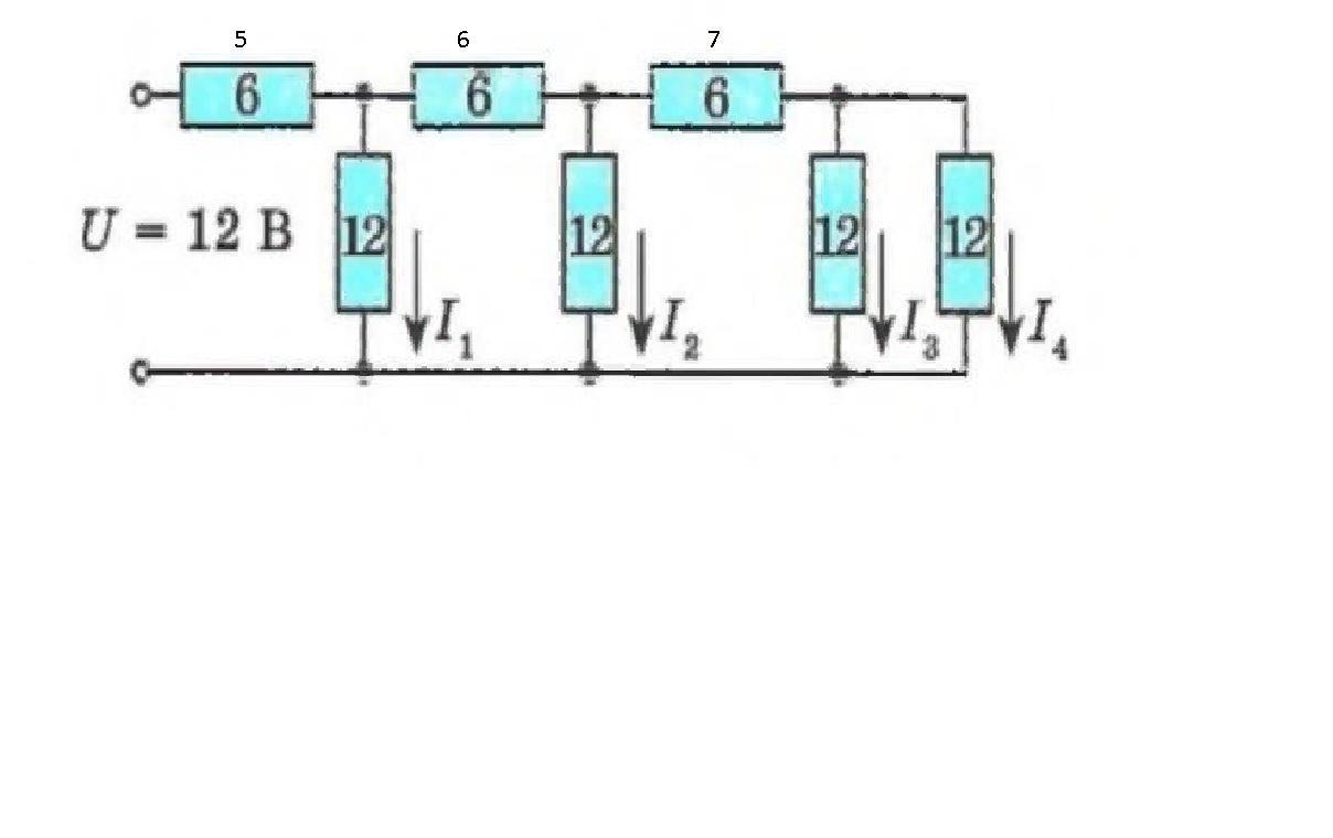 На рисунке представлена схема электрической цепи. Чему равны силы тока I 1, I 2, I 3, I 4? На резисторах указано их сопротивление в омах.