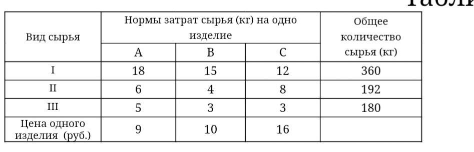 Для изготовления различных изделий А, В и С предприятие использует три различных вида сырья. Нормы расхода сырья на производство одного изделия каждого вида, цена одного изделия В и С, а также общее количество сырья каждого вида, которое может быть использовано предприятием, приведены в таблице.