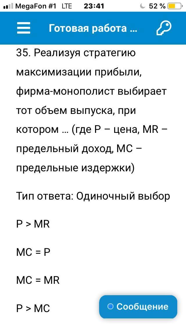 35. Реализуя стратегию максимальной прибыли фирма монополист выбирает тот объем выпуска , по котором MR = МС (где Р — цена, МR — предварительный доход, МС — предельные издержки).