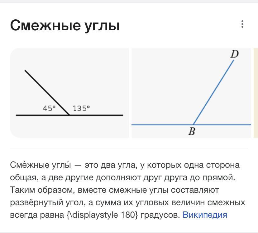 Сумма смежных углов равна развернутому углу и составляет 180°