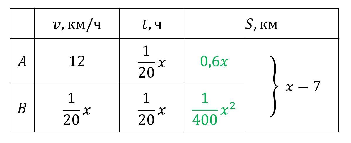 Встреча с А произошла через столько часов, на сколько километров в час продвигался В, то есть через 0,05x часа.