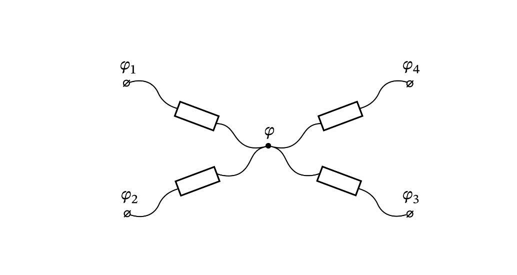 Определите значение потенциала φ4 точки фрагмента электрической цепи, состоящей из одинаковых резисторов, если известны потенциал узла φ=0 В и потенциалы точек φ1=6 В, φ2=2 В, φ3=−5 В. Ответ выразите в вольтах, округлите до целого числа.