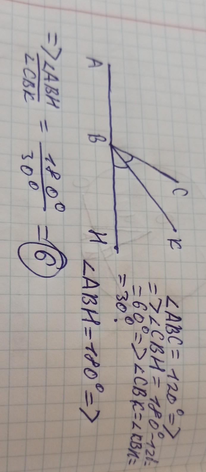 Смежный угол будет равен 180-120=60.Биссектриса разделит этот угол на два равных угла по 30. Во сколько.......120:30=4 ( раза)
