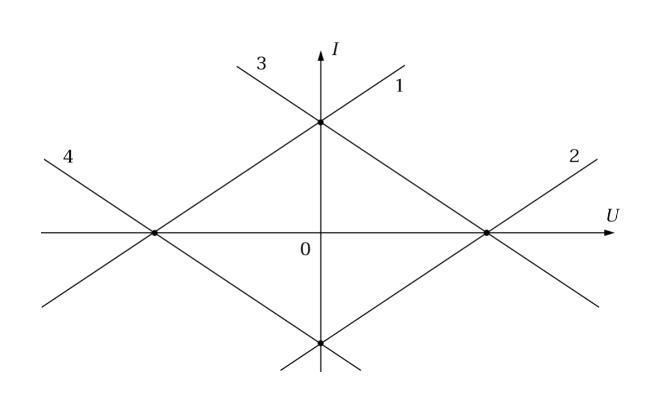 Какая ВАХ соответствует источнику питания, если в качестве положительного направления тока выбрано направление от «+» источника к «−», а в качестве напряжения выбрана разность потенциалов +−−? Ответ: 2