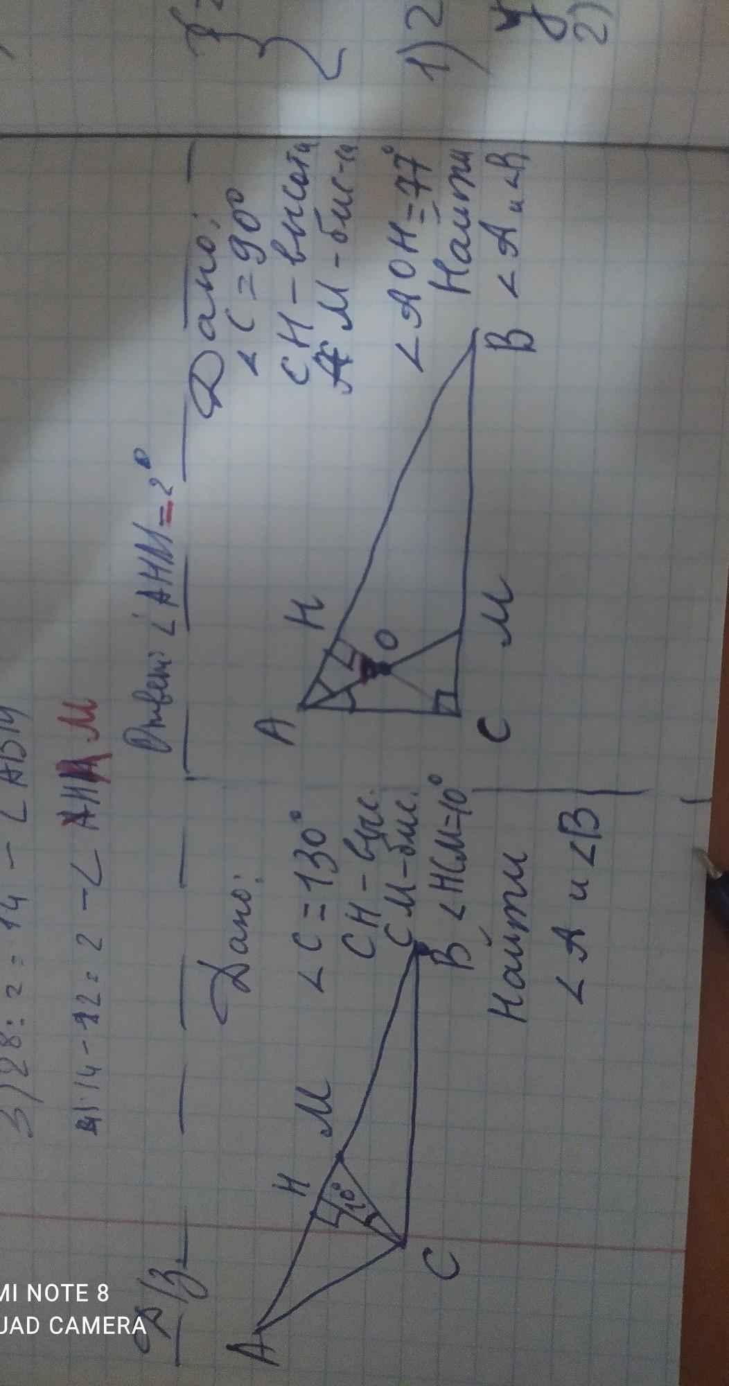 1) <НСВ=(130:2)+10=75°; <В=90°-75°=15°; <А=180-130-15=35°