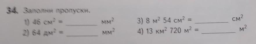 34. Заполни пропуски. см2 1) 46 см? 2) 64 дм? MM? мм? 3) 8 м2 54 см? 4) 13 км2 720 м? м?