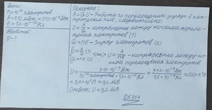 ) электронов. При этом было выполнено работы на 512 мДж. Чему равнялось напряжение между точками перемещения электронов?
