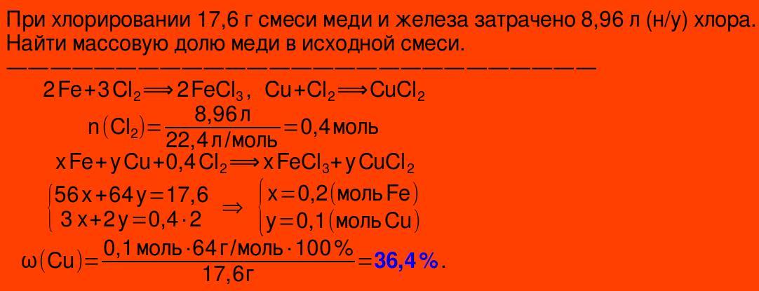 При хлорировании 17,6 г смеси меди с железом затрачено 8,96 л хлора (н. у.). Определите массовую долю меди в смеси.