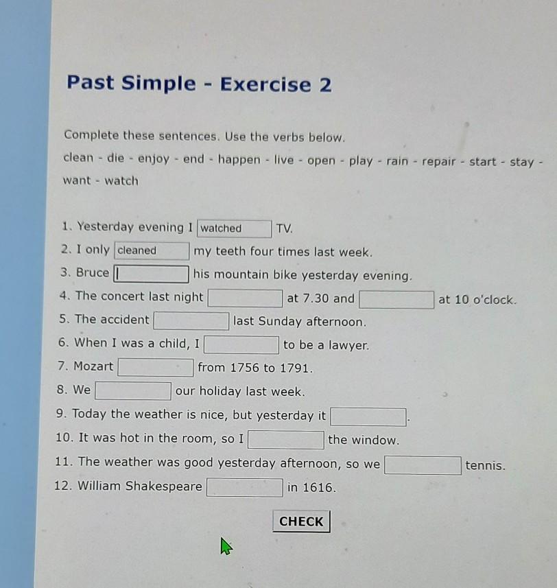 Past Simple - Exercise 2 Complete these sentences. Use the verbs below. clean - die - enjoy - end - happen - live - open - play - rain - repair - start - stay - want - watch at 10 o'clock. 1. Yesterday evening I watched TV. 2. I only cleaned my teeth four times last week. 3. Bruce his mountain bike yesterday evening. 4. The concert last night at 7.30 and 5. The accident last Sunday afternoon. 6. When I was a child, I to be a lawyer. 7. Mozart from 1756 to 1791. 8. We our holiday last week. 9. Today the weather is nice, but yesterday it 10. It was hot in the room, so I the window. 11. The weather was good yesterday afternoon, so we 12. William Shakespeare in 1616. tennis. CHECK