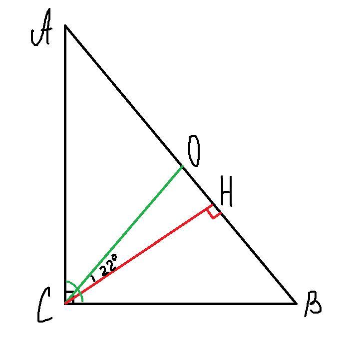 В прямоугольном треугольнике угол между высотой и медианой, проведёнными из вершины прямого угла, равен 22°. Найдите больший угол данного треугольни. ка. Ответ дайте в градусах.