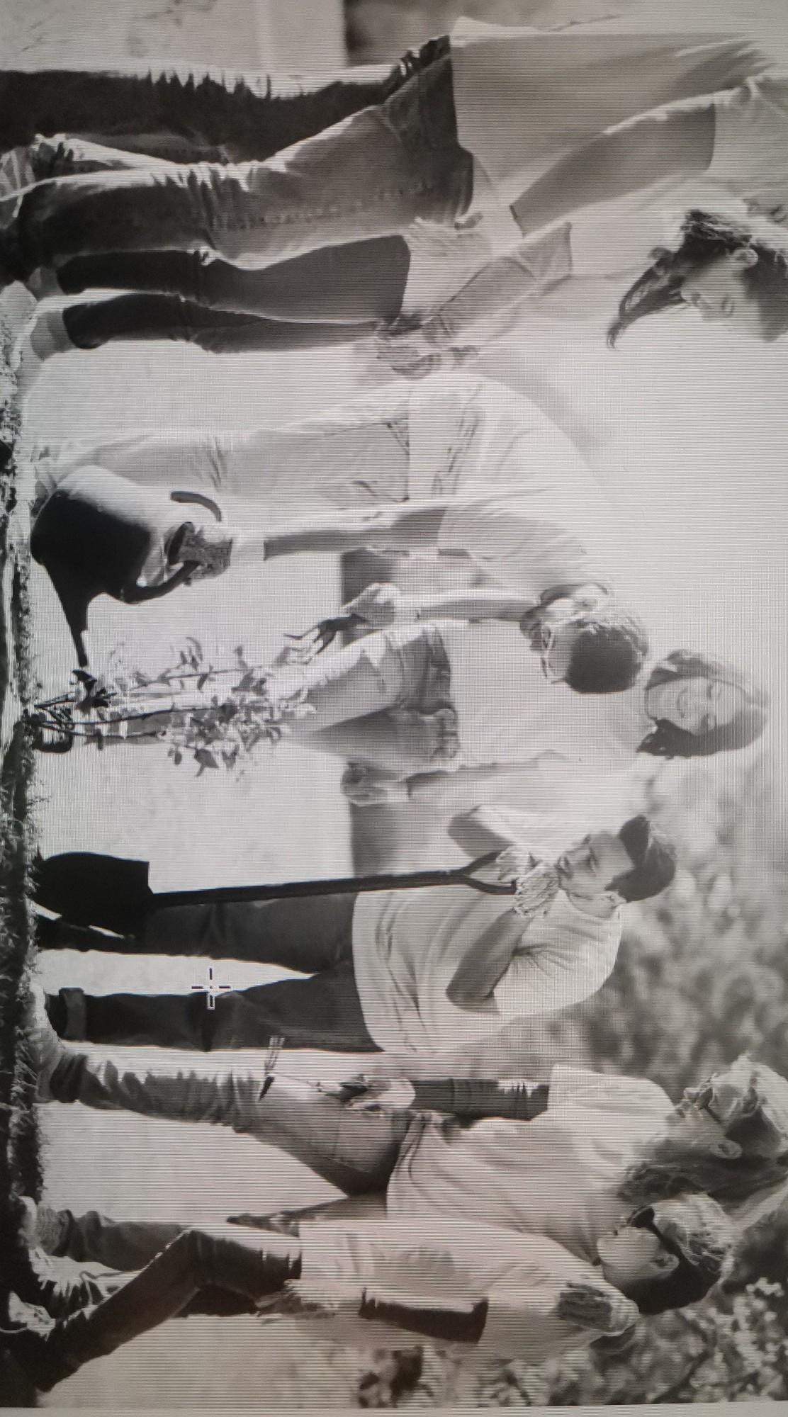 ребята на футболках и штанах они на школном участке это скорей всего весна у них грабли лопата и лейка они садят дерево им это очень нравится