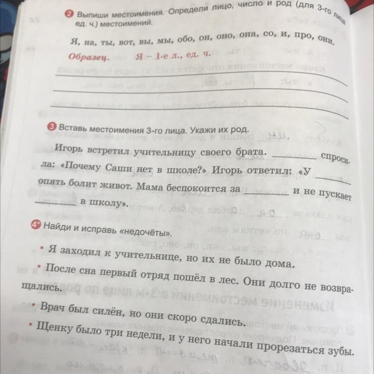 Игорь встретил учительницу своего брата. ОНА спросила: "Почему Саши нет в школе?" Игорь ответил: "У НЕГО опять болит живот. Мама беспокоится за НЕГО и не пускает ЕГО в школу".