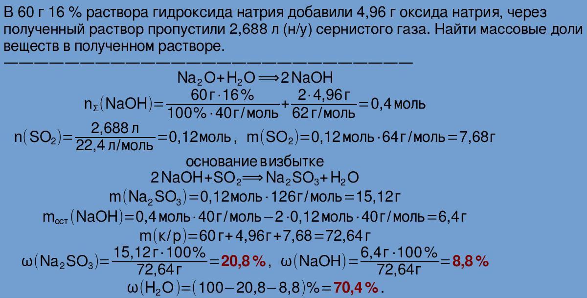 .В 60г 16%-го раствора гидроксида натрия добавили 4,96г оксида натрия. Через полученный раствор пропустили 2,688л сернистого газа. Вычислить массовые доли веществ в полученном растворе.