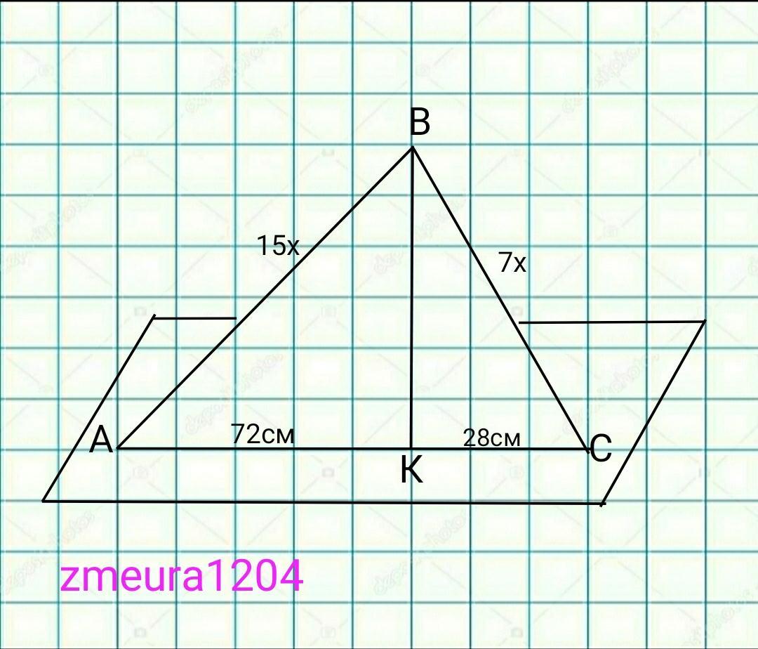 ВС:ВА=7:15; проекция наклонной ВА будет АК=72см; проекция наклонной ВС будет КС=28см.