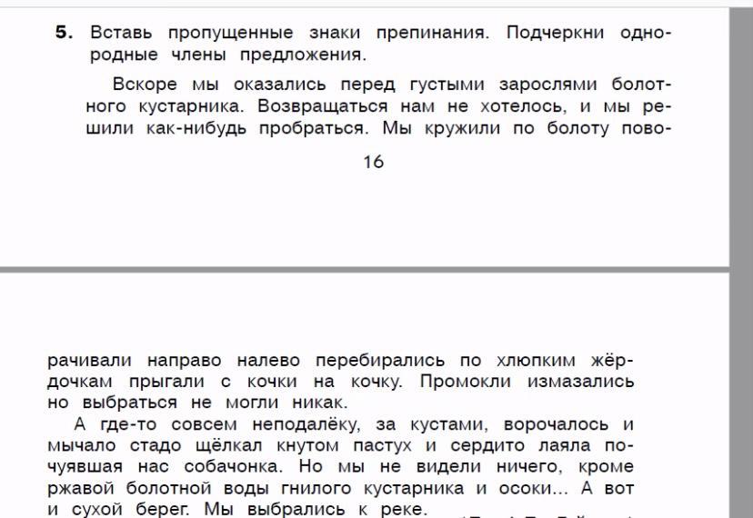 А где-то совсем неподалёку, за кустами, ворочалось (одн.сказуемые) и мычало (одн.сказуемые) стадо, щёлкал кнутом пастух, и сердито лаяла почуявшая нас собачонка. Но мы не видели ничего, кроме ржавой болотной воды (одн.дополнение), гнилого кустарника (одн.дополнение) и осоки (одн.дополнение)... А вот и сухой берег. Мы выбрались к реке.