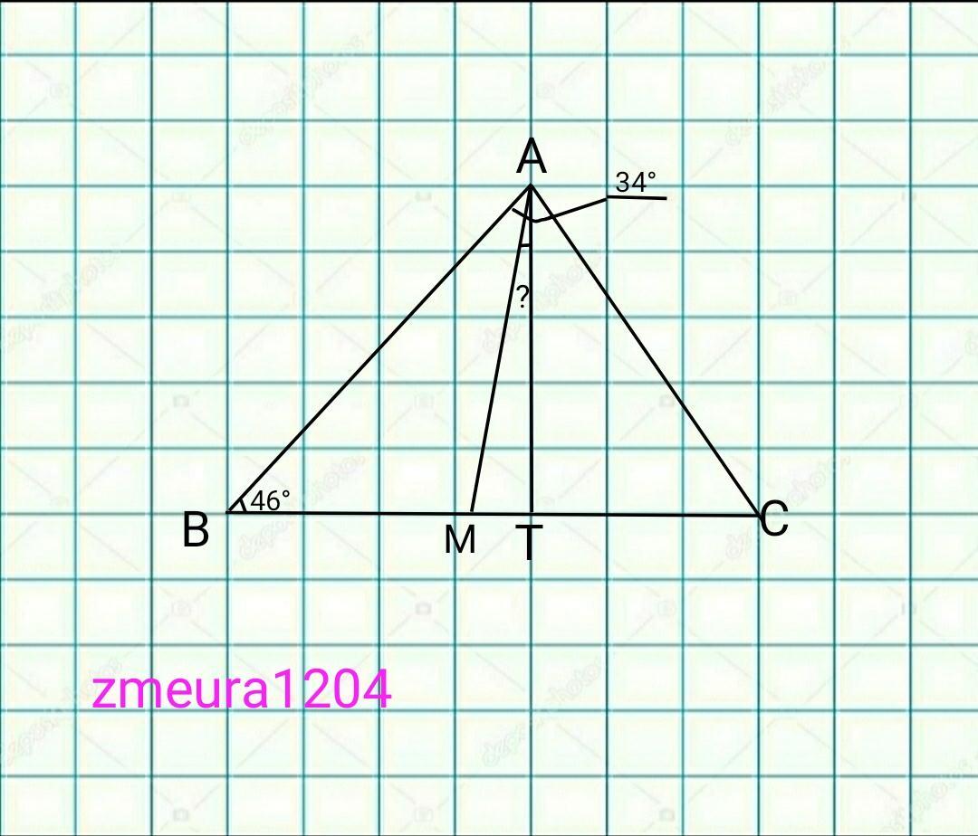 В треугольнике ABC проведены высота AТ и биссектриса АМ . Найдите угол ТАМ , если угол ВАC равен 34° , угол ABC равен 46°.