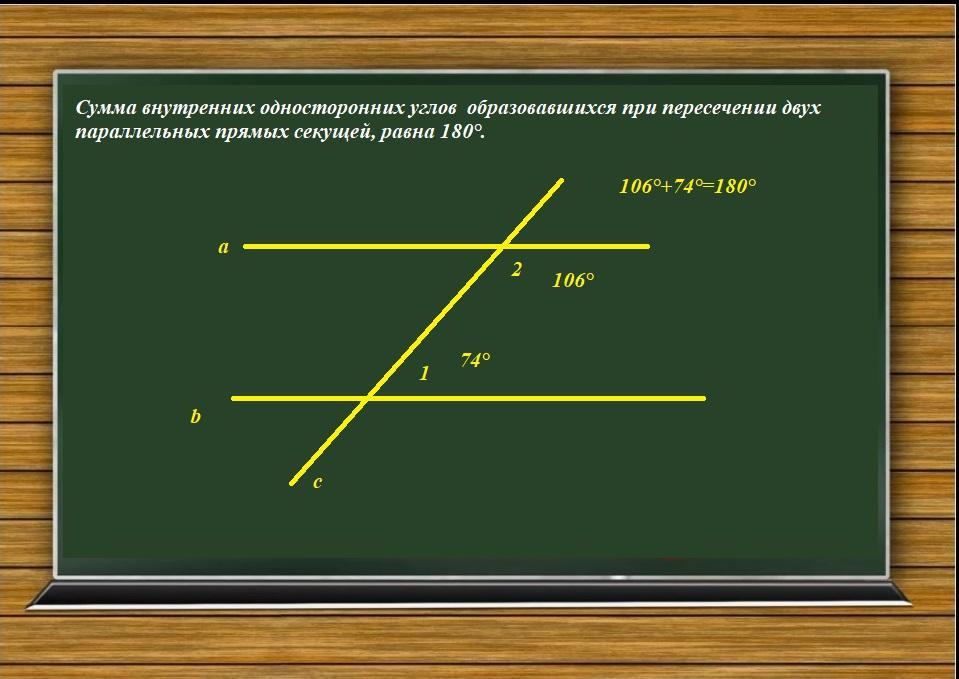 Сумма внутренних односторонних углов образовавшихся при пересечении двух параллельных прямых секущей, равна 180°.