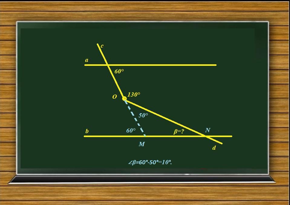 Получили тупоугольный треугольник OMN, у которого внешний угол равен 60°, как накрест лежащий при a║b и секущей с.