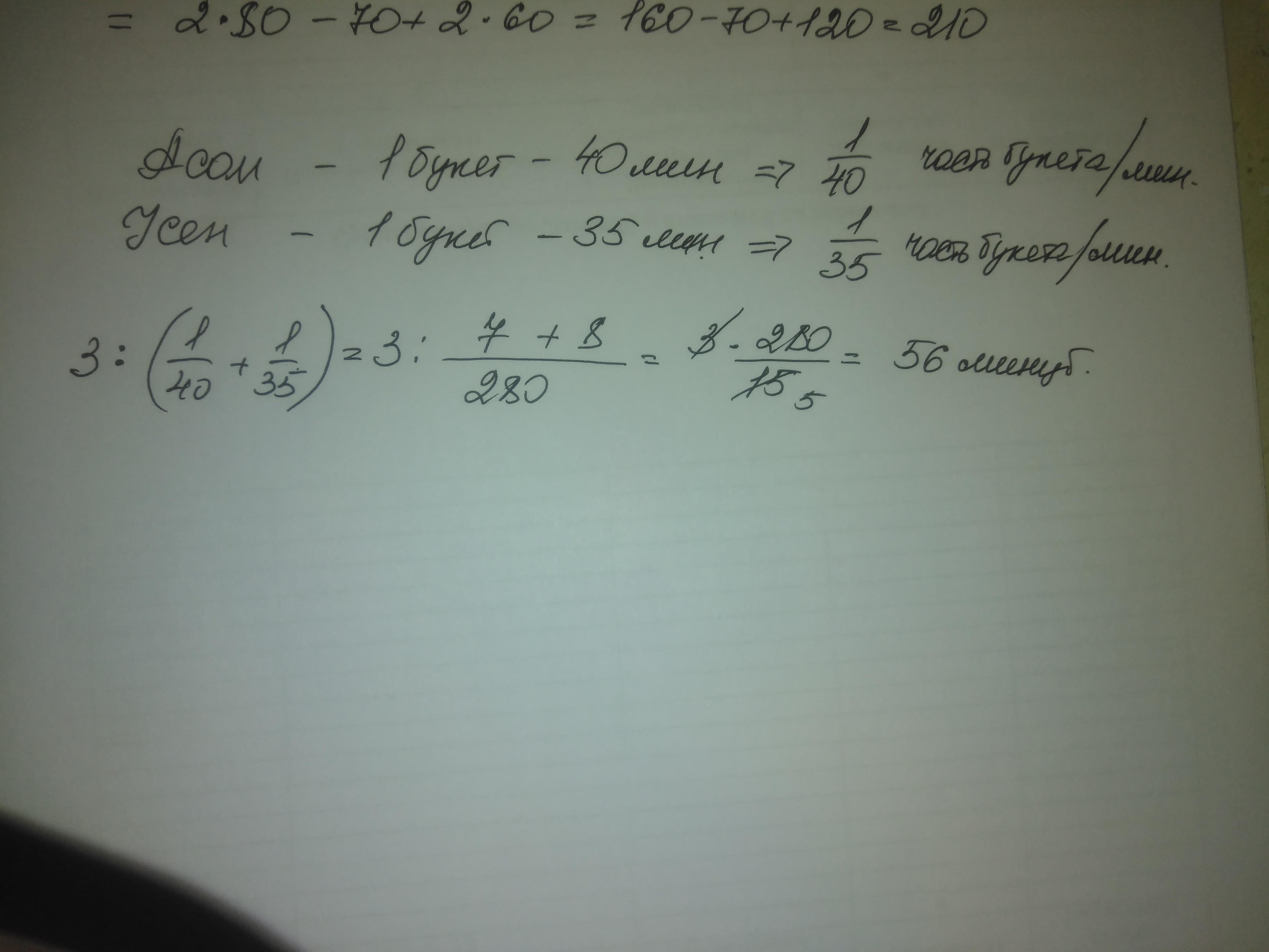 Асан и усен работают дизайнерами в цветочном магазине. Асан собирает букет за 40 минут, а Усен такой же букет - за 35 минут. За какое время они вдвоем собрали бы з таких же букета?