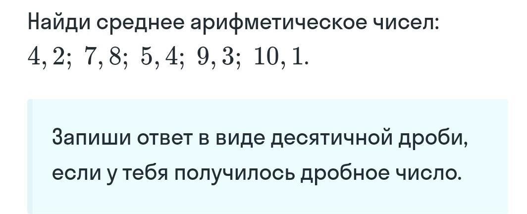 Найди среднее арифметическое чисел: 4, 2; 7, 8; 5, 4; 9, 3; 10, 1. Запиши ответ в виде десятичной дроби, если у тебя получилось дробное число.