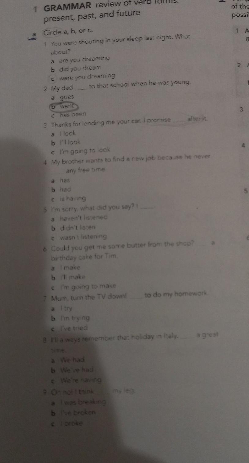 1 GRAMMAR review of verb forms: present, past, and future * og Circle a, b, or c. 1 You were shouting in your sleep last night. What about? a are you dreaming b did you dream c were you dreaming 2 My dad to that school when he was young a goes b went C has been 3 Thanks for lendirg me your car. I promise a look b l'lllook c I'm going to look 4 My brother wants to find a new job because he never any free time a has b had c is having 5 I'm sorry, what did you say?! a haven't listened b didn't listen c wasn't listening 6 Could you get me some butter from the shop? birthday cake for Tim, a I make b i'll make c I'm going to make 7 Mum, turn the TV down! to do my homework a I try b I'm trying a great c I've tried e I'll a ways remember that holiday in itely, time. a We had b We've had c We're having 9 Oo! I think a I was breaking b I've broken coroke