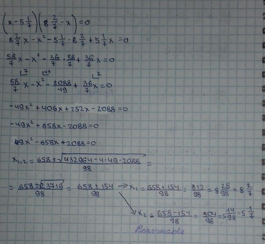 Ответ: (x-5 1/7)×(8 2/7-x)=0 ⇒х1=5 1/7, х2=8 2/7.