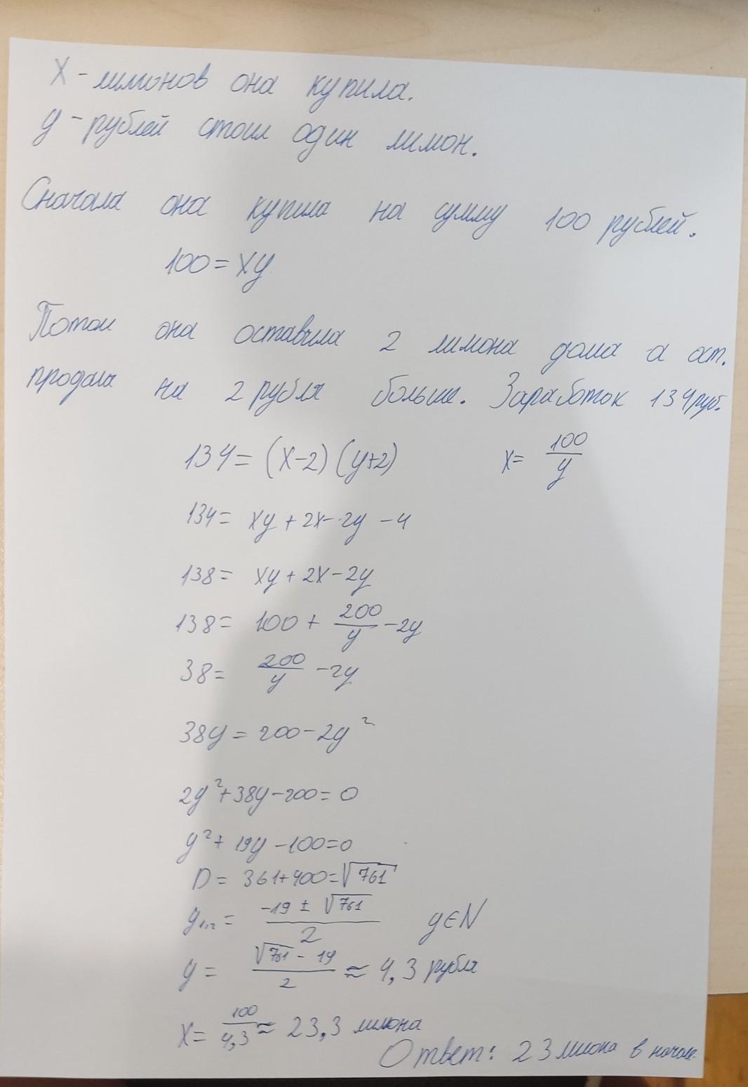 Катя купила лимонов на сумму 100 рублей. Она оставила дома 2 лимона. А оставшуюся часть лимонов продавала на 2 рубля больше за лимон. В итоге, у неё стало 134 рублей. Сколько лимонов Катя купила в начале ?