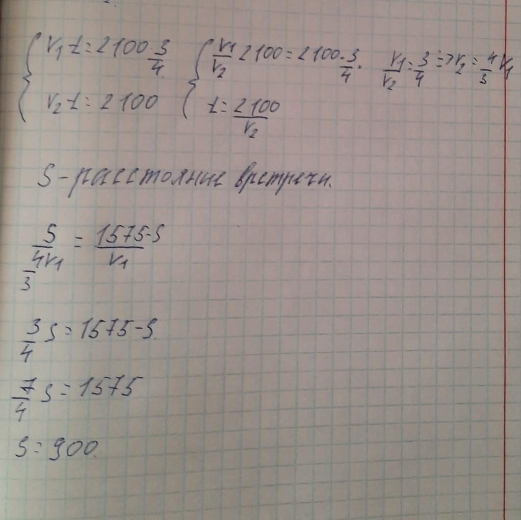 Лыжник Григорий ехал по довольно пологому склону, но, проехав три четверти пути, проявил неуклюжесть и сломал лыжи. Отбросив их за ненадобностью, он тут же побрел обратно. В момент поломки с вершины горы стартовал лыжник Василий. На каком расстоянии от вершины он встретит Григория, если длина трассы равна 2100 метров, а Василий закончит спуск ровно тогда, когда Григорий доберётся до вершины горы? Скорости лыжников и пешехода считать постоянными. Ответ 900м, но нужно решение