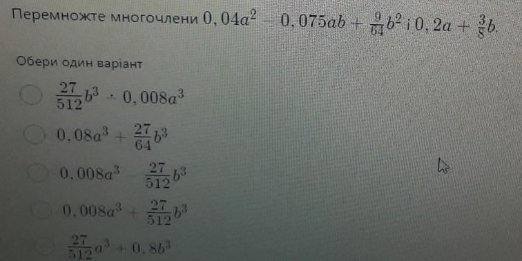 Перемножте многочлени 0, 04a2 0, 075ab +ь? 10, 2а + ь. Обери один варіант 27 512 64 5b3 0.0089 0,082? + o, oosa , o, oosa, за 0, 86 b3 3 помогите даю 80 баллов