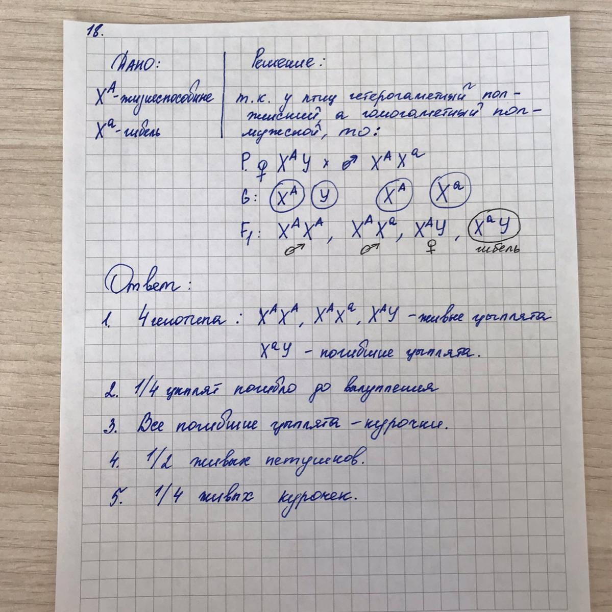18. У кур ген а является рецессивным и сцепленным с полом. Если в зиготе не содержится доминантного аллеля А, то цыплята погибают до вылупления из яйца. Самец, гетерозиготный по этому аллелю, скрещен с нормальными самками. Из яиц вылупилось 72 цыпленка.