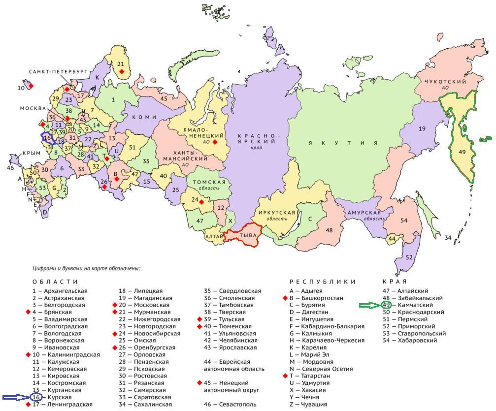 Пояснение: на карте Курская область имеет номер 16, Камчатский край номер 49. Республика Тыва не имеет номера, поскольку само название региона написано на его территории.