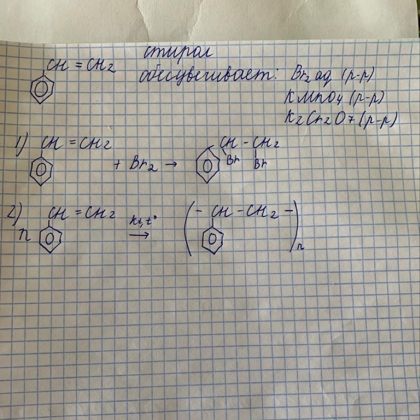Напишите структурную формулу винилбензола – стирола. Какие химические свойства имеет это соединение в отличие от бензола? Обесцвечивает ли стирол раствор брома? Напишите уравнения реакций бромирования и полимеризации стирола.