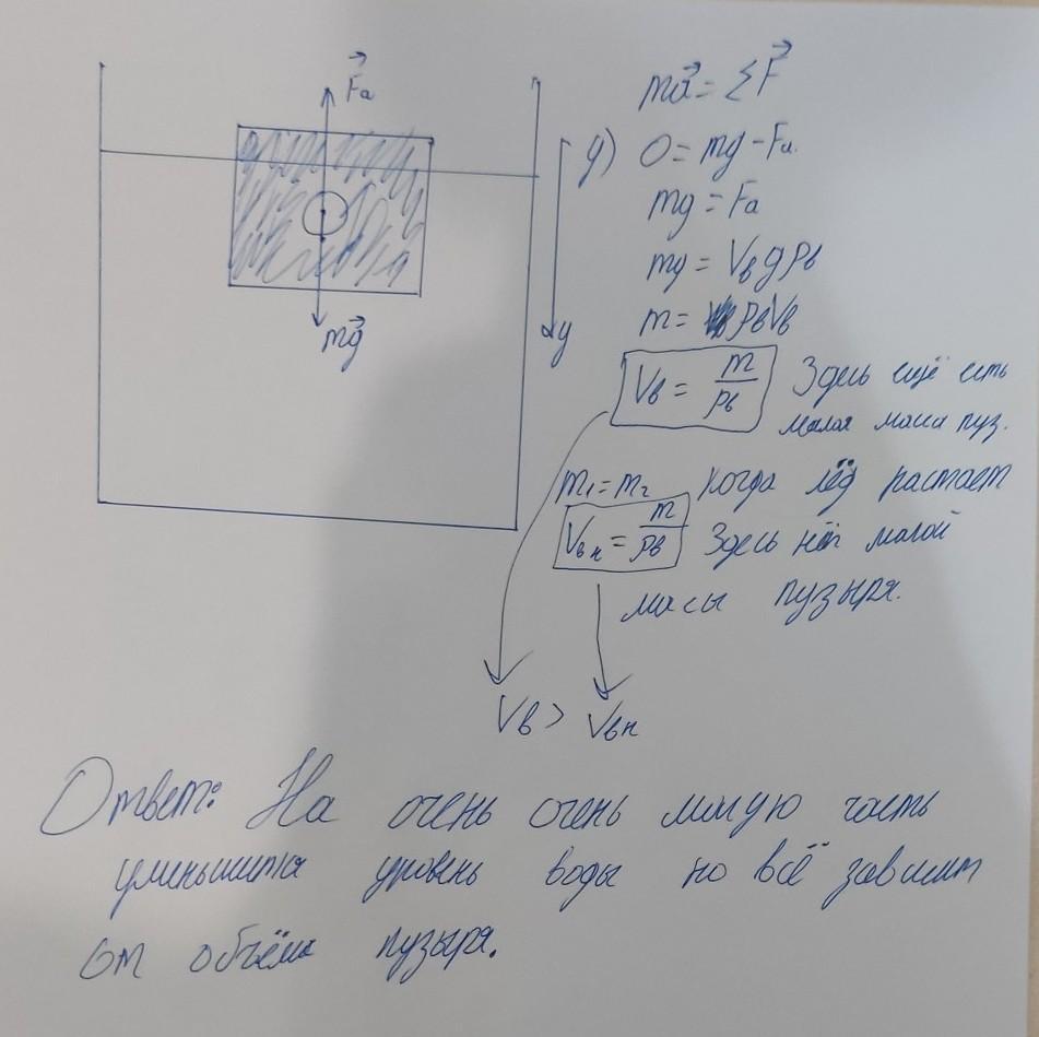 В стакане с водой плавает кусок льда с воздушным пузырьком. Как изменится уровень воды когда весь лед растает?