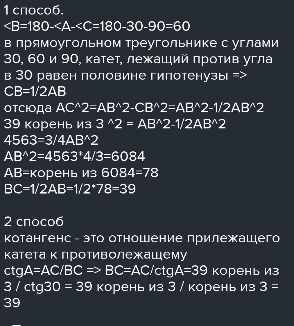 в прямоугольном триугольнике угол С прямой ВС=30 градусов. Найти АВ и АС.