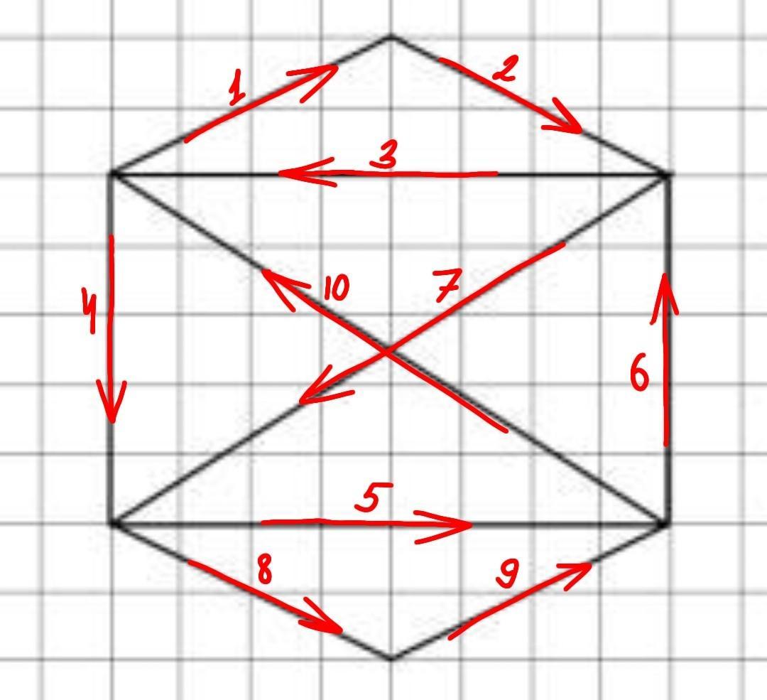Составьте программу рисования фигуры, изображенной на рисунке, таким образом, чтобы во время рисования перо не отрывалось от бумаги, и ни одна линия не проводилась дважды.