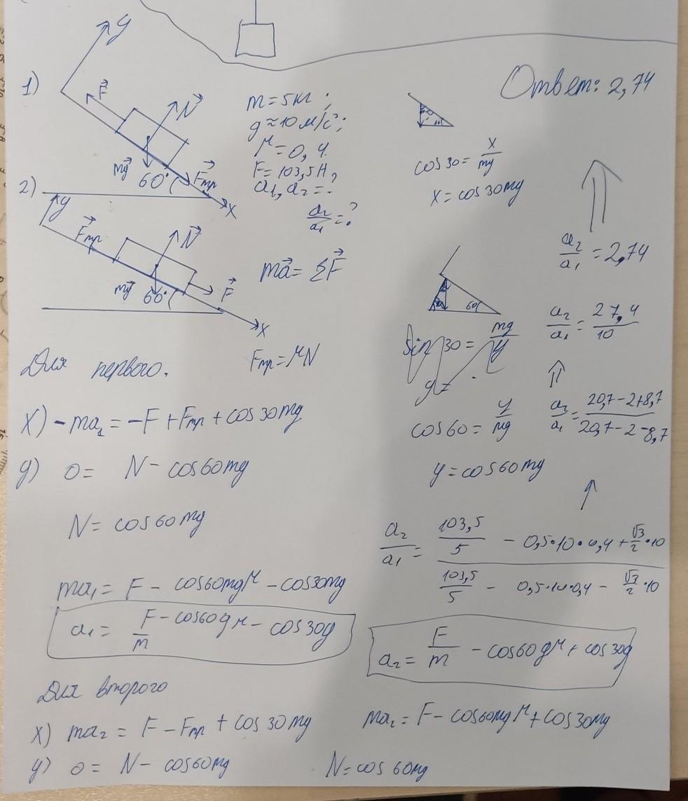 тело массы 5 кг движетс с ускорением а1 по наклонной плоскости ,образующий угол 60 градусов с горизонтом, под действием силы 103,5 Н, направленной вверх вдоль этой плоскости .При изменении направлени силы на противоположное тело движетс с ускорением а2. Найти отношение а2/а1,если коэффициент трения равен 0,4 найти